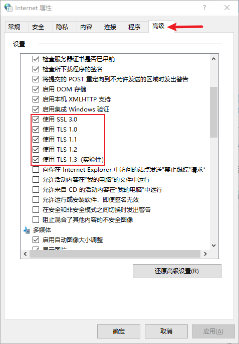 路径:打开运行(win+r),输入inetcpl.cpl,进入“Internet 属性” 选择”高级”,勾选红框内的选项: